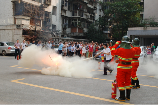 下午4时整,一股浓烟从武汉燃气大楼六楼蔓延开来,紧促的火灾警报声立即响起。接到火灾报警后,现场总指挥有条不紊地展开了部署,立即传呼物业公司相关人员前往现场查看并检查相关设备设施,将现场情况报告给监控中心,命令各单位专兼职消防队员迅速冲进现场进行救援疏散。大楼内的员工用毛巾捂住口鼻,有序地迅速沿疏散路线逃离“火场”,整个疏散过程安全、快速、有序,不到10分钟,所有人员疏散到集合地点。随后,物业公司在燃气大数院内安全集合点进行了一场消防灭火的示范,并由物业公司员工及燃气大楼内单位的工作人员代表使用灭火器对油桶进行灭火。