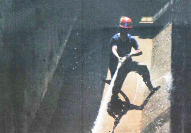 58岁的工人徐国民穿着下水裤,一层层地下到反应池,每下到一层就用水枪对反应池进行冲洗,并用抽水机将泥浆抽到过渡区。在过渡区,徐国民的同事徐文清也穿着下水裤顺着竹梯,下到了过渡区的底部,齐腰深的淤泥让他行动颇为不易,他同样用高压水枪冲洗着过渡区的淤泥。