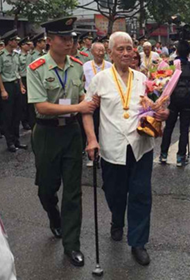 阮成发还为5位抗战老战士代表佩戴了“中国人民抗日战争胜利70周年纪念章。”在接受纪念章前,89岁高龄的宋培华老人举起右手,敬了一个标准的军礼。他说,这个军礼代表着自己对牺牲战友的怀念,向英烈们致敬。