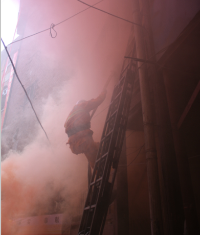 下午2点30分,现场指挥一声令下,消防疏散演练正式开始。随着烟雾弹的投放,浓密的黑烟迅速在演练区域房屋内弥漫开,一位居民马上模拟向“119”报警,两个单元的住户在义务消防员带领下弯着腰,捂住口鼻,按照每层楼的疏散指示图快速逃离火场,并有序撤离到安全地带。演练完毕后,李警官向现场人员逐一讲解了消防器材的种类、使用方法及灭火注意事项,并现场演示灭火器操作程序、液化石油气罐如何灭火,高处如何利用身边的物体逃生等。简单的培训讲解后,住户们都积极踊跃地使用灭火器进行了实地灭火演练。