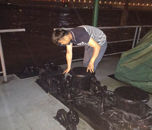 堤角水厂工作人员将取水船通道升高并安装防护绳