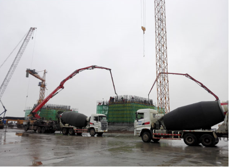 杨泗港大桥是武汉市第十座长江大桥、长江上首座双层公路桥、世界上跨度最大的双层悬索桥。主桥采用主跨1700米的单跨双层钢桁梁悬索桥,其中,1号主塔位于汉阳岸,2号主塔位于武昌江边。1号主塔塔顶标高为254.9米,承台以上塔高231.1米(包含塔座高3米)。塔柱施工采取划分大节段施工,标准浇筑高度为6米,共分38节施工,本次完成混凝土浇筑施工的第一节塔柱高度为6米。