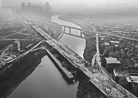跨朱家河段桥梁全部为钢箱梁结构,宽34-40米不等,重3100吨,施工时采用步履式顶推设备分5次将钢箱梁顶推完成,每次顶推距离约30米。预计本月下旬朱家河桥将完成沥青摊铺,12月中上旬完成路灯安装和地面标线划设等收尾工作,可保证年底通车目标。