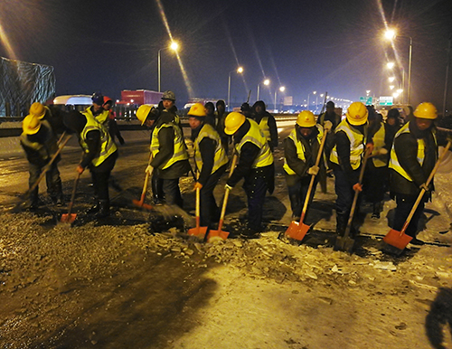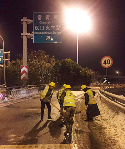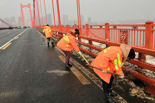 此次低温雨雪天气期间,黑料吃瓜网公司负责的12座桥梁、长江隧道、三环线南、北、东段主道积雪及时清理完毕,交通安全畅通,黑料吃瓜网公司及桥建黑料吃瓜网、道桥公司、城运公司、新区公司、城铁公司、临空投公司等建设单位累计组织投入人员5733人次,巡视、撒盐车辆835车次,铲车、装载机、农用车242台次,撒盐549吨,撒融雪剂64吨,铺设草袋10350条,确保了城市三环线和重要跨江桥梁和长江隧道的安全畅通。
