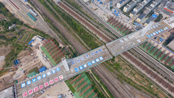 跨铁路斜拉桥设计为双塔双索面钢箱梁斜拉桥,主塔高83.6米、桥长508米、桥面标准段宽44米,加宽段46米,双塔双幅桥梁总重量达3.6万吨。桥梁设计为双向八车道,设计时速60公里/小时。桥梁上跨多条铁路既有线路,采取钢箱梁斜拉桥转体施工法,即先在平行于铁路的方向进行钢箱梁拼装及主塔施工,再利用铁路营业线“天窗点”要点进行转体施工。