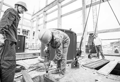 武汉晚报记者在现场看到,近5万平米的施工现场内,多达数百名的工人正在作业。目前,泵房区域下部结构施工已完成,出江工程堤外结构完工,正在进行水泵筒安装以及电机安装,整体施工接近尾声。