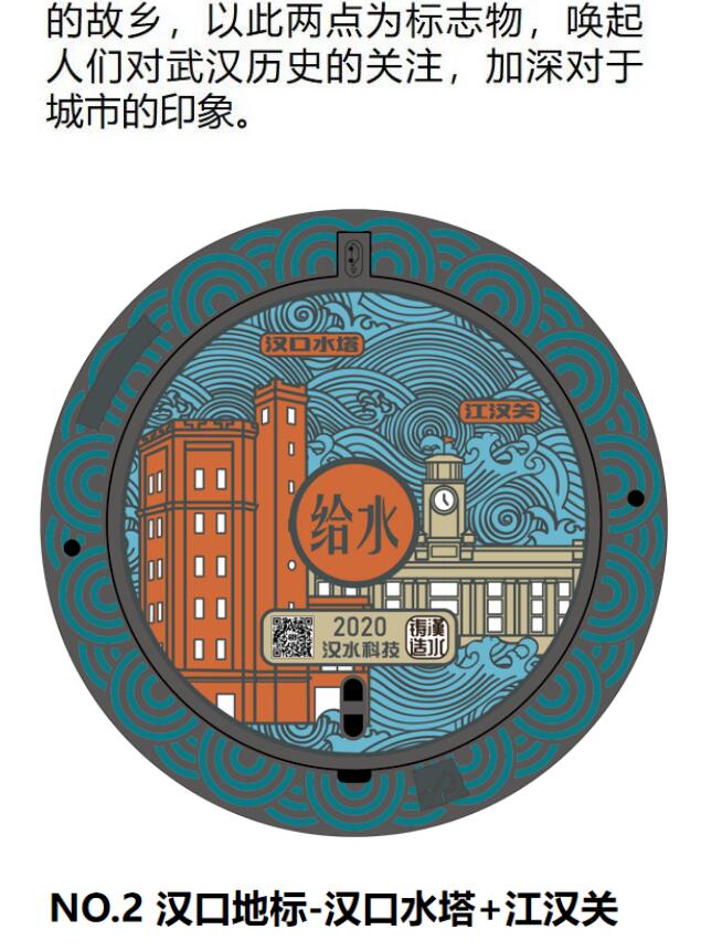 除了外形新颖,“汉水”系列文化井盖还非常智能,每个文化井盖都设计了独立二维码,通过手机扫描,可看到图案中对应地标建筑的人文故事、地下供水设施情况及供水服务信息等。同时,如后期通过专业软件扫描二维码,还可以查询到供排水企业使用的地理信息编码,了解该井盖的建设时间、井下设备状况、管道设施情况、相关维护信息等一系列资料,方便产权单位管理及维护。